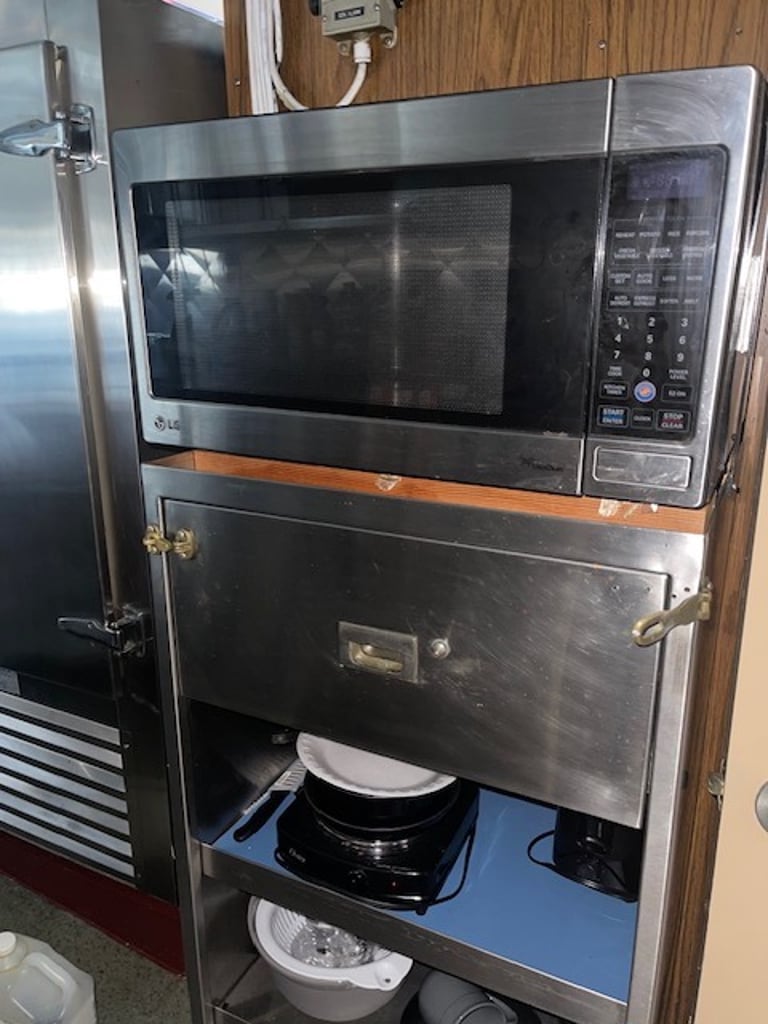 Stove-top range & grill, Oven, Full-size microwave oven, Deep freezer, Full-size refrigerator, Mini-refrigerator.